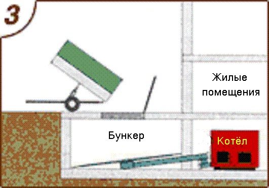 Уровень пола в бункере несколько приподнят, по сравнению с уровнем пола котла и доставка осуществляется горизонтально.