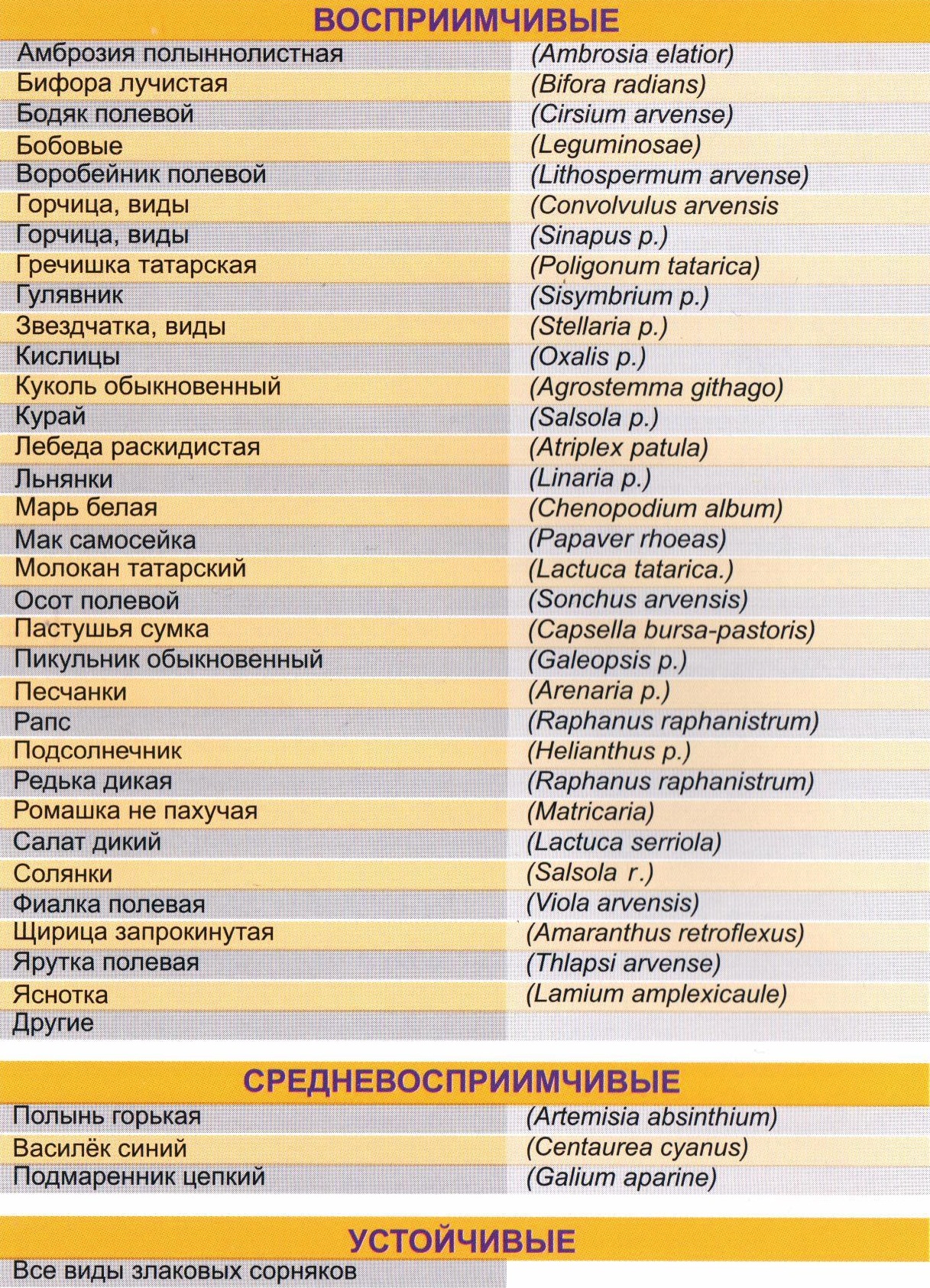 - Широкий спектр контролируемых сорняков, включая осоты, бодяки и др. обеспечивается оптимальным сочетанием двух действующих веществ