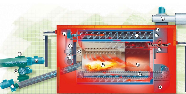 Горение руглируется по значениям кислородного датчика. Подача топлива осуществляется как и в котлах серии RHK-AK многолетнеиспытанной HEIZOMAT - системой доставки.